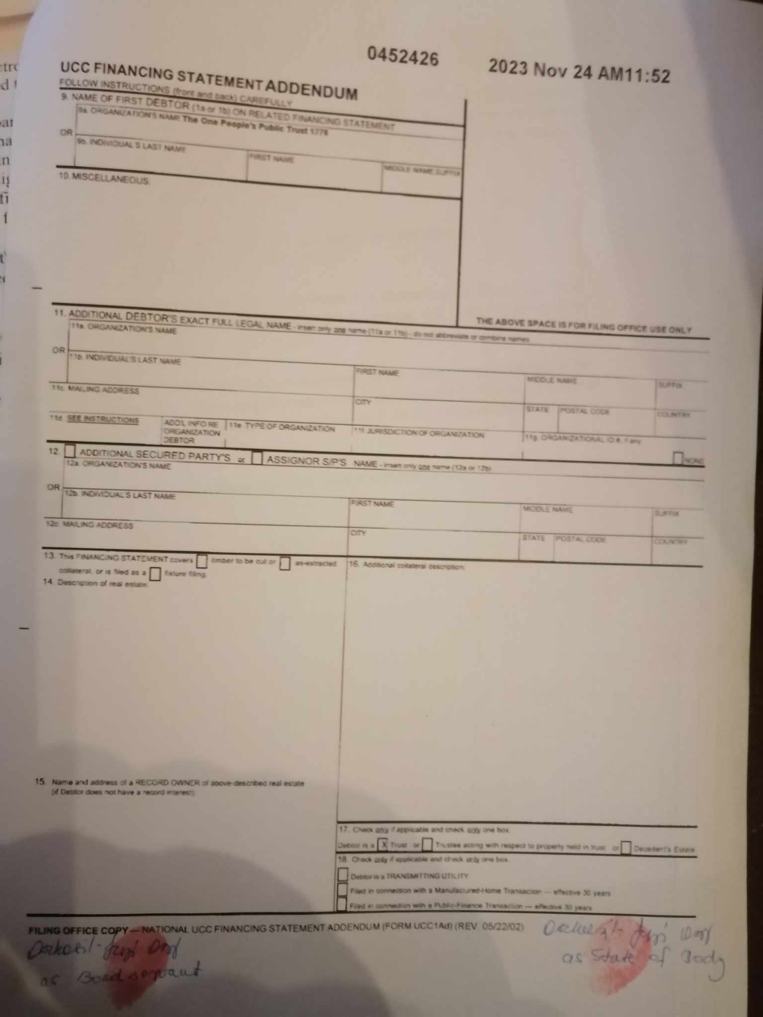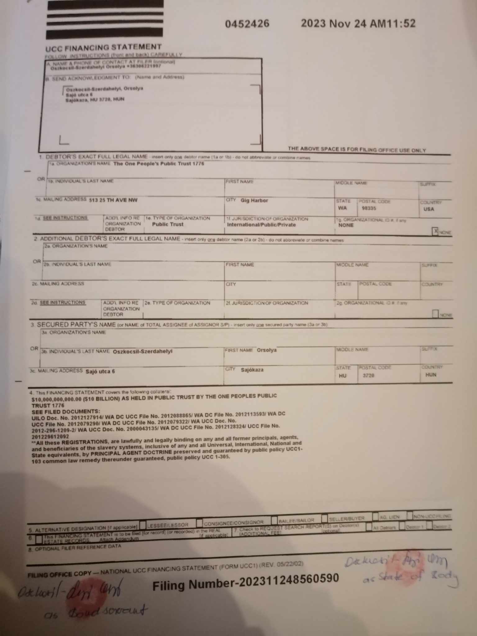 DC UCC nyilvántartási száma 2012079322, mely értesített a teremtéssel, törvénybe iktatott az értesítés